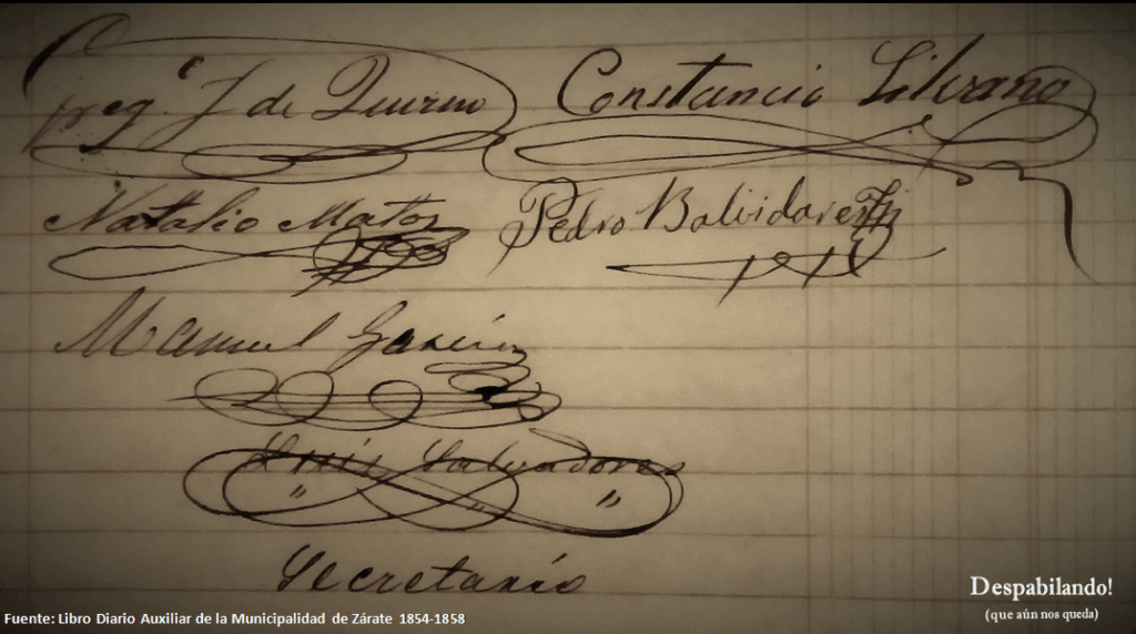 Hoy elegimos que la foto que ilustra esta especial fecha no sea la del puente Zárate-Brazo Largo, este apenas tiene algunas décadas de existencia y poco que ver con la ocasión. En la fotografía adjunta se aprecian las firmas de aquellos seis integrantes de la primitiva Comisión Municipal que tuvo la tarea de dar los primeros pasos en la gestión de un proto gobierno municipal, entre mulas, carretas, casas de adobe, pajonales, precario muelle-puerto y todo, o casi todo, por hacer…