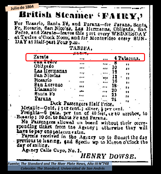 Junio de 1864. Anuncio comercial de la British Steamer ‘FAIRY’, empresa británica de vapores que hacía la carrera por el Río Paraná entre la Capital y el litoral, con escala en los más importantes puertos del recorrido, entre ellos Zárate, of course.