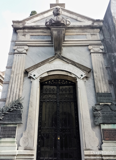 Bóveda familiar exponiendo el busco del viejo castrense, hombre de armas en épocas de guerras civiles, todas. Lo ligado al zarateñaje nuestro es que compró campos en nuestro partido, of course, pero más que nada fue su descendencia la fuertemente relacionada con nuestro día a día, en especial dos de sus muchos hijos: Benjamín Nazar y Rómulo Nazar, este último fue presidente de la municipalidad de Zárate (antes que se llamasen intendentes) entre 1868 y 1870. Por muchas décadas los Nazar tuvieron su empresa agropecuaria al noroeste del partido, más o menos una gran franja al oeste de lo que hoy es el Km 103 de la Ruta 9 hasta el Río Areco. La vieja estancia El Rincón del Ombú (hoy lugar de eventos Estancia Ricardo Francisco) era de la familia. Familia de donde luego devienen otros apellidos con importantes campos también en nuestro Partido, tales como Nazar Anchorena, Quesada Urquiza de Nazar y la lista sigue…