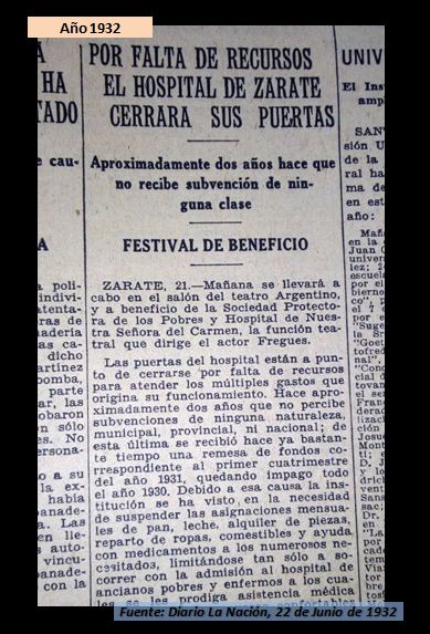Zárate, junio de 1932. El Hospital de Zárate se encuentra en crisis por falta de fondos y de apoyo oficial. Acuden una vez más a la ayuda de la comunidad para solventar gastos e insumos.