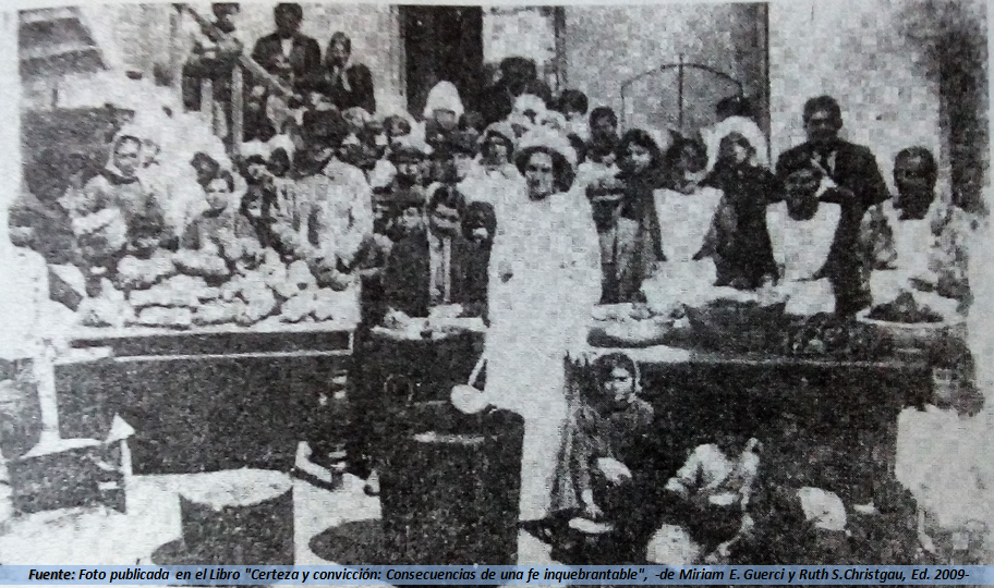 CUNDE EL BUEN EJEMPLO. COMIDA DIARIA PARA 100 POBRES. Altruismo de los esposos Hotton. Producida la generosa iniciativa de la familia Casentini, de la que nos ocupamos en otro lugar, el jefe del culto evangélico en nuestra ciudad señor Jorge Hotton y su esposa, han resuelto seguir el ejemplo y llevarlo aún más allá, porque beneficiará diariamente a numerosas familias. Los esposos Hotton han dispuesto establecer en su domicilio una cocina en la que se preparará comida para distribuir diaria y gratuitamente a 100 pobres. Esa comida será repartida desde el 1° de Septiembre próximo en el domicilio de los generosos donantes. Los pobres interesados, para tener derecho a esa comida deberán presentar un certificado de pobreza que será expedido en la Secretaría de la Intendencia Municipal desde hoy y durante las horas de oficina. Con ese certificado los esposos Hotton los incluirá en la lista para que puedan concurrir todos los días a retirar la comida. Tal es la verdadera caridad, que salvará por un tiempo de las torturas del hambre a numerosos seres que la aguda crisis ha sumido en la miseria. El buen ejemplo, como lo suponíamos, cunde y esperamos que se difunda más aún, sobre todo entre los vecinos pudientes, cuyos nombres asoman a los puntos de la pluma con ganas de extenderse sobre el papel para despertar sus sentimientos humanitarios”.