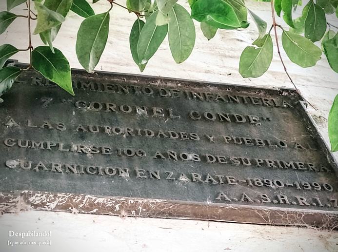 Caminando nuevamente las calles zarateñas, vemos la existencia de otra placa. Desapercibida detrás de los árboles. Inmediato a la esquina de 9 de Julio y Rivadavia. Dice: