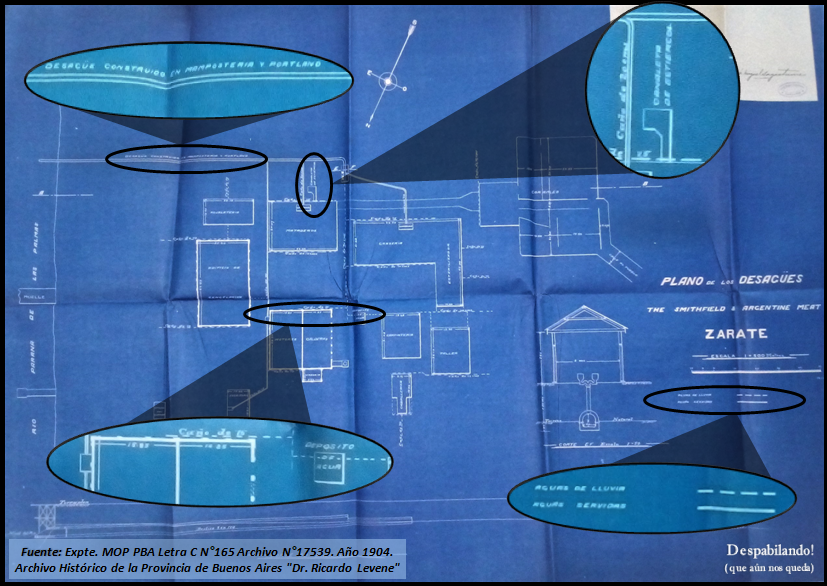Analizando los expedientes de época, muy bien conservados gracias a la labor del Archivo Histórico de la Provincia de Buenos Aires “Dr. Ricardo Levene”, nos encontramos con el pedido elevado al Ministerio de Obras Públicas de la provincia por la firma The Smithfield and Argentine Meat Cía Lda. en el año 1904, solicitando aprobación de plano “para construcción del Frigorífico que la empresa va a construir en Zárate”. En él se puede apreciar el establecimiento con el que proyectó el inicio de sus actividades, detallando usos y construcción de los siguientes sectores: Mataderos, Edificio de coagulación, Hojalatería, Grasería, Esterilizador, Corrales, Galpón para sierras, Carpintería, la Caballeriza, Escritorio y Almacén, Calderas-Sala de Máquinas-Herrería y por último una aclaración que no pasará desapercibida por el Departamento de Ingenieros de la Provincia: “el desagüe de todos los residuos del establecimiento se hará al Río Paraná”.
