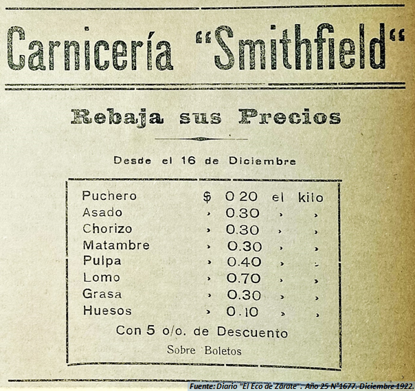 Diciembre de 1922. La venta minorista al público del frigorífico Smithfield ofrecía cortes populares a precios rebajados, por ejemplo, a 30 centavos el kilo de matambre. ¡Que épocas!