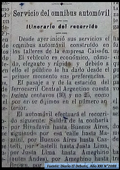 En 1919 Martín Caissón compra la cochería de los Güerci, anunciando ampliación de servicios y viajes de ‘larga distancia’. En enero de 1920, Caissón innova y agrega a los ómnibus un guarda en el interior de los mismos, encargado de percibir el importa del viaje a fin de evitar demoras e inconvenientes. Con éxito continúa su empresa y es en octubre que anuncia la construcción en sus talleres de un “ómnibus automóvil” que se presenta: “iluminado a luz eléctrica, apropiado lo mismo para la época de los calores como para invierno”, con recorrido por el casco céntrico de la ciudad para cumplir con los horarios de los trenes, y además servicios hasta el cementerio.