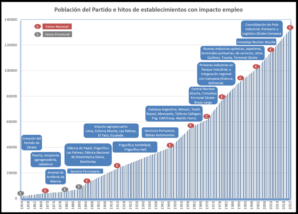Antes de cerrar el año animamos una temática censal. A modo ilustrativo, poder ver gráficamente la evolución de la población en el Partido de Zárate, desde que fue creado hasta estos tiempos. Sumando también un plus, el marcar en esa cronología aquellos establecimientos que en cada época impactaron en el desarrollo socioeconómico, aportando una paleta más para ver la evolución demográfica en paralelo.