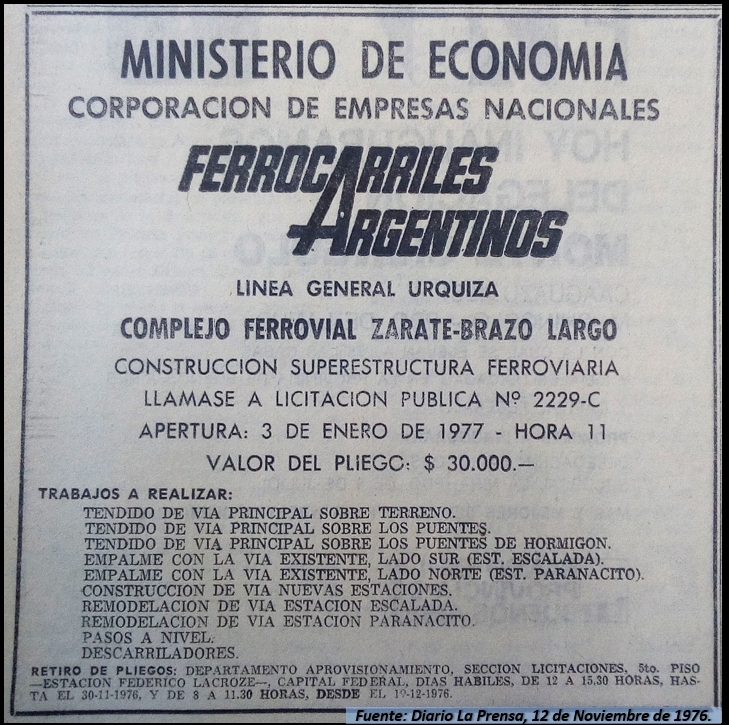 Además, imagen de uno de los apoyos de los tramos ferroviarios, donde se distingue el sello “Techint-Albano” empresa constructora del complejo. Y de yapa el aviso de licitación original para la superestructura ferroviaria, publicado en los periódicos de mayor difusión nacional de la época. Se hizo a nuevo desde Escalada hasta la actual estación Libertador General San Martín (Ibicuy).