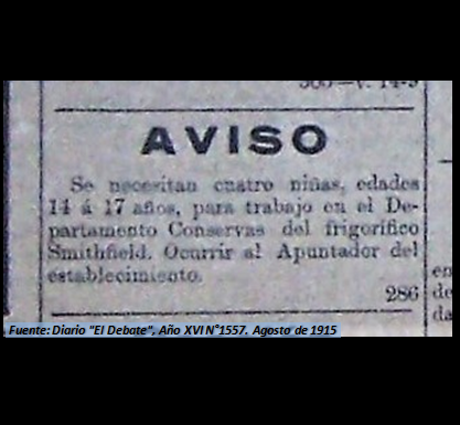 *Agosto de 1915. Aviso de búsqueda laboral. Piden “cuatro niñas” para trabajar en el área de Conservas. La mano de obra femenina y el trabajo infantil fueron muy requeridos en diversas áreas, especial las que aplicaban más de la destreza manual y del detalle que de la fuerza bruta. Sin embargo, niños y mujeres (niñas, jóvenes y adultas) ganaban por igual y muy mal: en el mejor de los casos un tercio menos que los hombres, cuando no, era mucha más grande la brecha, en mismas condiciones paupérrimas y largas jornadas, extenuantes. Pantallazo para ilustrar escenarios previos de lo que fue parte de uno de los reclamos en las bravas luchas obreras estalladas en 1917.