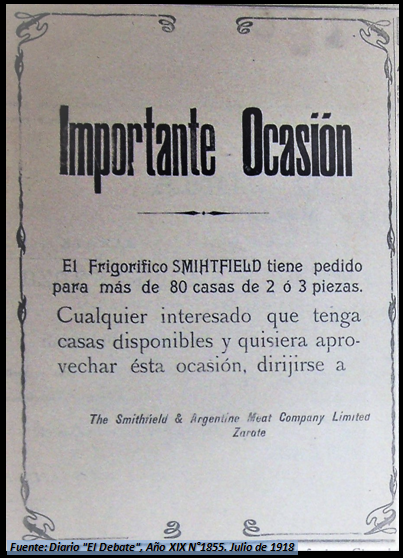 *Julio de 1918. El frigorífico en búsqueda de numerosas casas para alquilar. Desde hace tiempo en Zárate se siente la “escasez de viviendas” para satisfacer la demanda de un poblado que crece, principalmente, al ritmo de las industrias de mano de obra intensiva. No es ajeno a esto el establecimiento mencionado, que hace tiempo viene haciendo saber de su necesidad de encontrar viviendas para dar a sus empleados como parte de la oferta laboral y sus condiciones. ¿Cómo siguió la cosa? Dado el apremio y los incordios de conseguir, a los pocos meses decide tomar la posta y encara la construcción de sus propias viviendas en tierras de su propiedad cercanas al complejo fabril. Nace así el germen de lo que será Villa Smithfield.