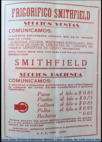 A través de avisos y publicidades también se pueden leer datos e info que ayudan a armar historia o ilustrar muchas de sus cuestiones. Arrancamos esta nueva sección con el frigorífico Smithfield y una arbitraria elección de publicaciones que nos cuentan lo siguiente: