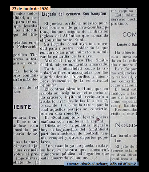 El crucero de guerra Southampton brindó importantes servicios en la emblemática ‘GrandFleet’ de la primera guerra mundial. Tras esta, es enviada para operaciones en Sudamérica. Un jueves 24 de junio de 1920 llega al muelle del frigorífico Smithfield en misión diplomática y porque no en recorrida de ver como andaban las inversiones inglesas en la región, que no eran para nada menores. Por entonces en Argentina existía una docena de grandes frigoríficos, tres de los cuales estaban en el partido de Zárate y eran ingleses. Esto viene a colación porque en la década del ’10 habían sucedido las dos primeras “Guerra de las Carnes”, una puja político-comercial entre frigoríficos ingleses y norteamericanos por mayor cupo de este importante mercado mundial, donde las instalaciones argentinas eran de gran relevancia, y se venía años más tarde una “tercera guerra”. No era casualidad entonces que la Marina Real se dé una vuelta por el barrio cada tanto para ver cómo andaba la cosa.