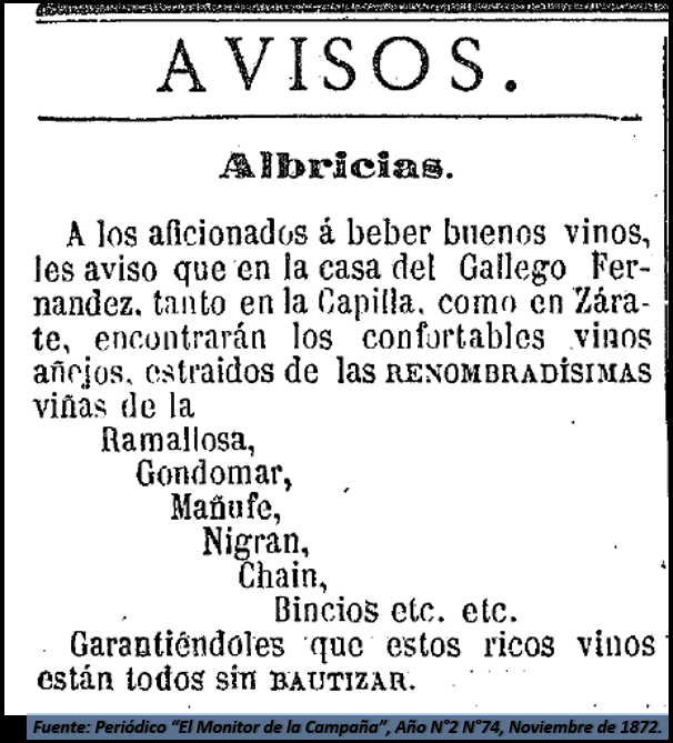 Anuncio de la Casa del “Gallego” Juan Antonio Fernández, la cual estaba ubicada en el “camino del muelle” de Zárate.