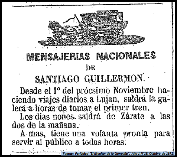 Vemos aquí, en este aviso de finales de 1871, que se anuncia los días impares a la madrugada sale desde el entonces pueblito de Zárate la diligencia que, pasando por Capilla del Señor, alcanza el pueblo de Luján. Todo esto con el fin de poder llegar a horario para el primer tren que salía desde allí a la Capital, del viejo Ferrocarril Oeste. Según itinerario de entonces este tren llegaba a la estación Parque (inmediata a donde hoy está el Teatro Colón) a las 12 del mediodía.