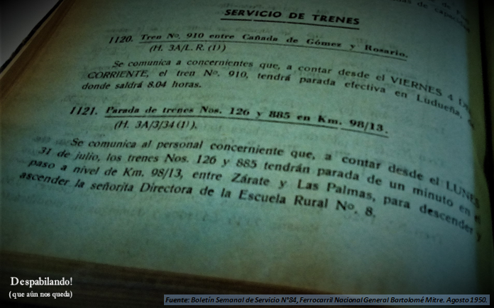 “Se comunica al personal concerniente que, a contar desde el lunes 31 de julio, los trenes números 126 y 885 tendrán parada de un minuto en el paso a nivel de Km. 98/13, entre Zárate y Las Palmas, para descender y ascender a la señorita Directora de la Escuela Rural N°8.”