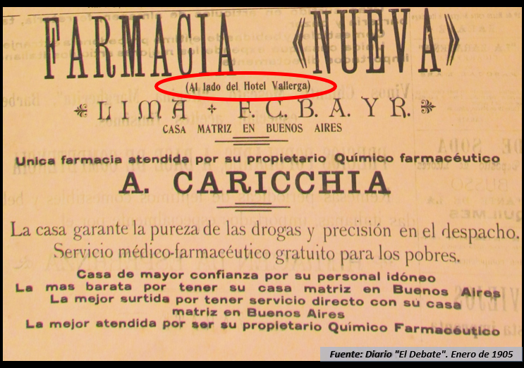 4- Año 1905. Farmacia Nueva. De las primeras en este rubro en Lima. Con la sola referencia de que quedaba “al lado del Hotel Vallerga”. Pero imagínese igual, en el incipiente pueblito que era, ¿dónde podía haber un hotel? Frente a la estación o frente a la plaza. No mucho más.