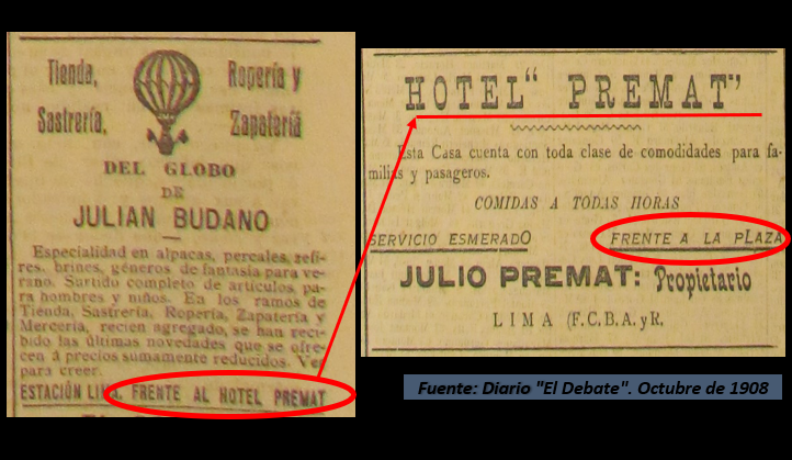 5- Año 1908. Referencias aunadas. Por un lado, la tienda Del Globo que cita como referencia nada más que estar “frente al hotel Premat”. ¿Y dónde estaba el hotel Premat? En la otra hoja aparece su anuncio, el Hotel Premat estaba “frente a la plaza”. Muy lejos no podía andar.