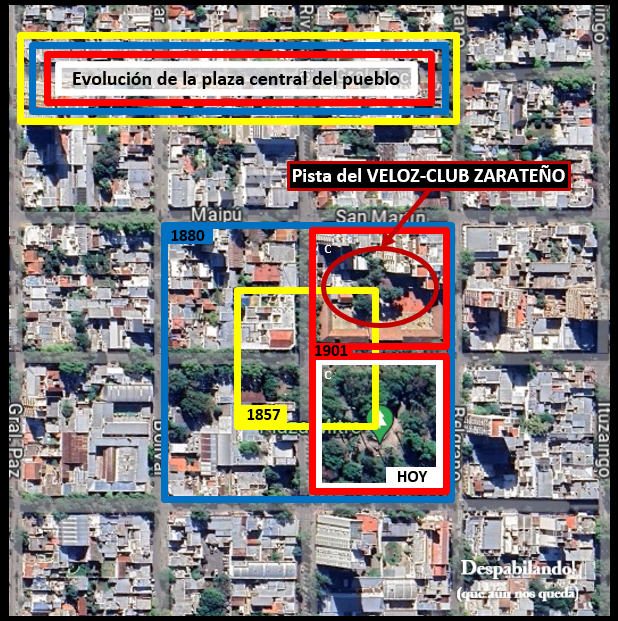 El Veloz-Club Zarateño contaba con muchos entusiastas del pedal. La pista se encontraba, como se ha citado, en la plaza frente a la actual plaza Mitre, manzana donde hoy se encuentra la Escuela Nº1. Para esto es importante repasar cómo evolucionó la plaza central a lo largo del tiempo. Originalmente en el trazado del pueblo, y hasta la segunda mitad del siglo XIX, la plaza central tenía la dimensión de una manzana, pero ubicada al centro de lo que sería el espacio de cuatro manzanas. Visto así, quedaban anchas calles en su entorno. Luego se amplió el terreno de plaza, pasando a ser efectivamente de cuatro manzanas, delimitadas por las actuales Bolívar, Maipú, San Martin, Belgrano, Justa Lima de Atucha y Félix Pagola. Hacia finales del siglo XIX quedó la mitad: la actual plaza y la manzana de enfrente hacia el río. Por eso en 1899 le ceden esta última a los ciclistas para establecer su velódromo.