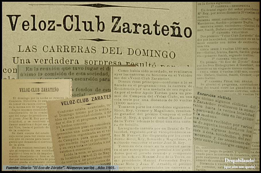 El Veloz Club Zarateño. Pionero club deportivo de la localidad, para regocijo de los amigos del pedal. Es esta actividad la que ahora es la más antigua que se conoce organizada en nuestra comunidad. Como para pensar en ello e imaginar cómo fue, cuando cruzamos esas veredas céntricas de la ciudad.