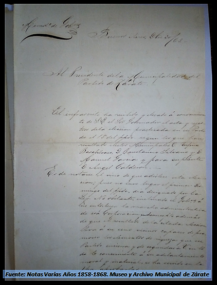 No Es De Ahora: Año 1863. Nota del Ministerio de Gobierno de la provincia de Buenos Aires al presidente de nuestra Municipalidad, declarando estar viciadas las elecciones municipales de Zárate. Detalle: