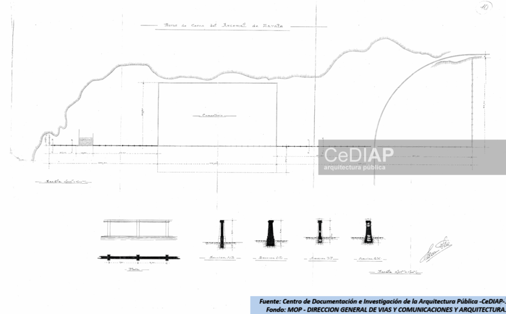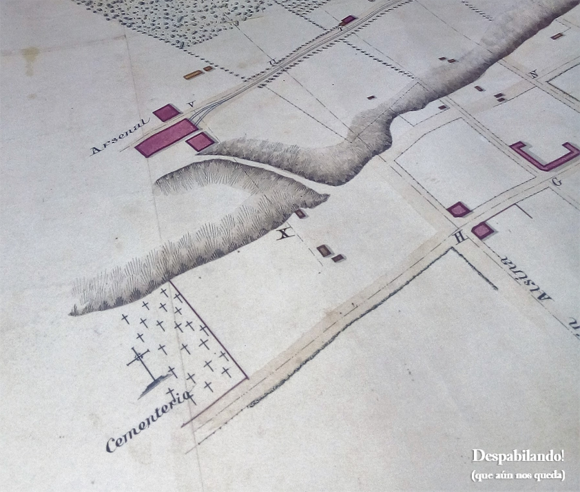 Confirmado entonces que el paredón del Arsenal se eleva sobre tierras que eran del antiguo cementerio. Resta por confirmar, entonces, su posición exacta. Para ello vamos a acudir al CeDIAP (Centro de Documentación e Investigación de la Arquitectura Pública) quienes llevan adelante una labor en extremo apreciable, poniendo en valor patrimonio gráfico, técnico e histórico de documentos, asistencia e investigaciones referidas a edificios públicos en el país, dentro de la Agencia de Administración de Bienes del Estado (Paseo Colón 171, CABA). En su amplio archivo podemos encontrar planos de obras en el Arsenal de Zárate, y entre esto justamente la construcción del paredón tan nombrado, en 1901. Allí se observa la ubicación exacta del viejo Cementerio. ¡Eureka! Prácticamente se situaba en su mayor parte dentro del predio que quedó para el Arsenal; si lo replicamos a hoy sería: entre la esquina suroeste de las calles French y Chacabuco hasta pasar unos metros Beruti, y del borde de la barranca hasta unos metros “adentro” de las manzanas que lindan a la calle Chacabuco, formando así un rectángulo de aprox. 110×86 metros.