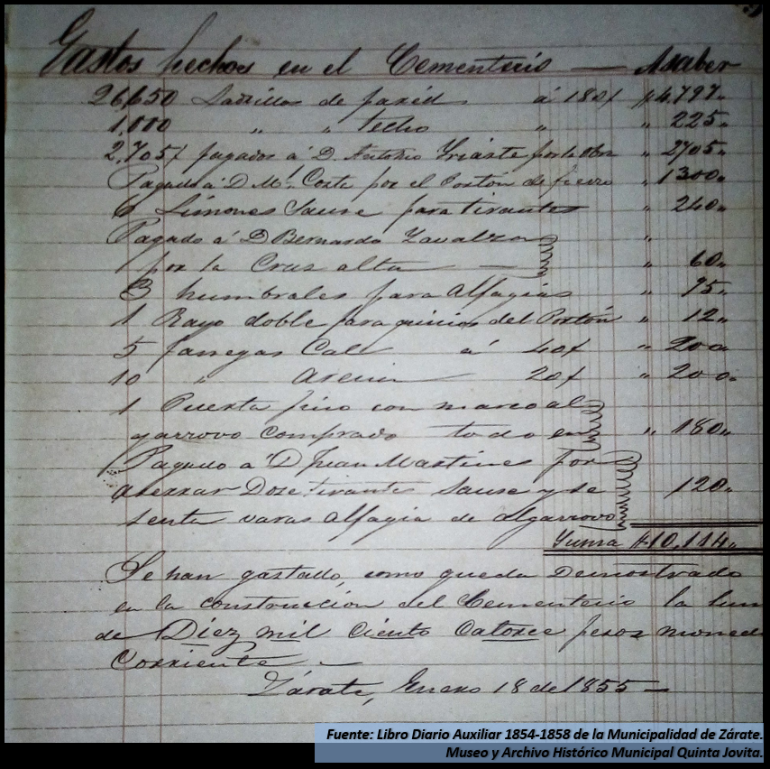 Nuestro primer cementerio, pues, se elige erigir en terrenos algunos metros alejados de la original traza urbana, hacia el norte; es decir pasando la calle Valentín Alsina en dirección a las barrancas. Para finales de 1854 ya se encuentra habilitado. Los detalles de gastos que ha demandado su construcción, nos cuenta que se utilizaron, entre otras cosas, algo más de 27 mil ladrillos y que contaba con “portón de fierro” y una “Cruz alta”. La obra, a cargo de Don Antonio Iriarte, incurrió en un gasto de $10.114 m/c, un monto para nada despreciable teniendo en cuenta que el ingreso anual que la Municipalidad presupuestaba por aquellos años en concepto de “Derechos de Puerto” -la actividad local más importante de entonces-, rondaba similares valores.