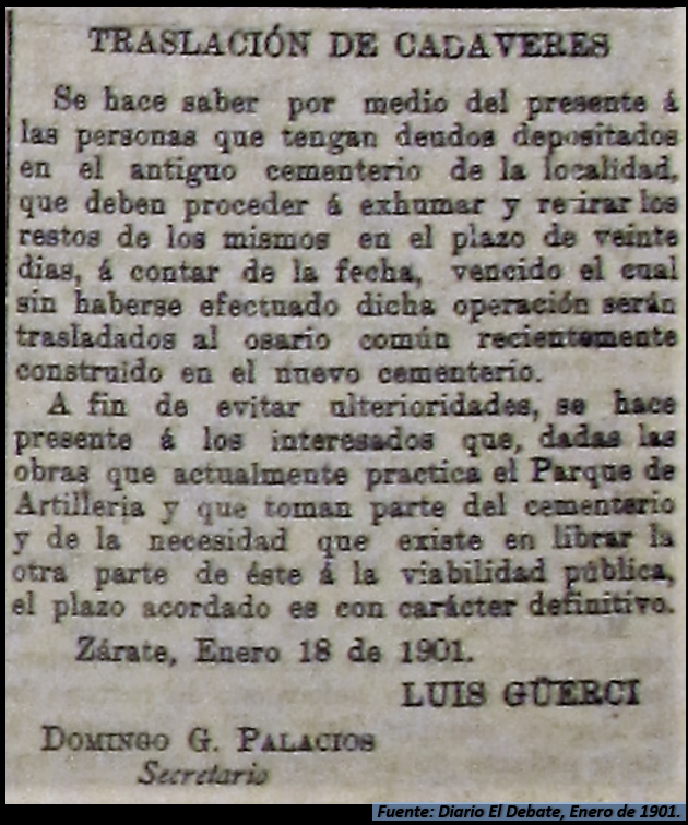 Intendencia Municipal. Aviso. “Zárate, 12 de Junio de 1900. Se hace saber a las personas que tengan deudos depositados en el antiguo Cementerio de esta localidad, que deben proceder a exhumarlos a la brevedad posible, a fin de dejar expedito el terreno en que han de practicarse las obras de ensanche del Parque de Artillería…”.